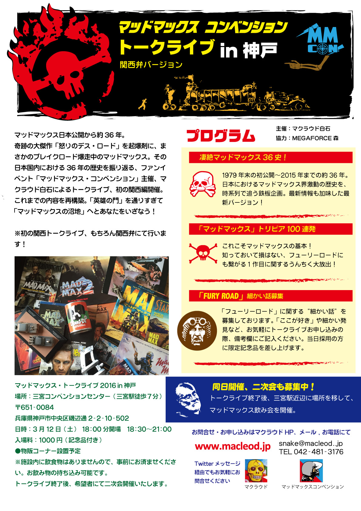 奇跡の大傑作「怒りのデス・ロード」を起爆剤に、まさかのブレイクロード爆走中のマッドマックス。その日本国内における36年の歴史を振り返る、ファンイベ ント「マッドマックス・コンベンション」主催、マクラウド白石によるトークライブ、初の関西編開催。これまでの内容を再構築。「英雄の門」を通りすぎて「マッドマックスの沼地」へとあなたをいざなう!