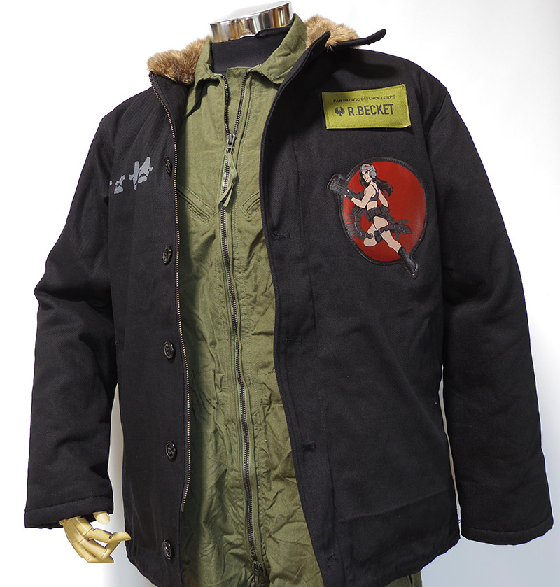 ようやく発売です!背面のジプシーマーク、左胸のネームパッチとノーズアート、右胸のカイジュウ・キルマークをフィーチャー。パシリム冒頭にちらっと登場するベケット兄弟着用のレザーコートをイメージしたデッキジャケットです。