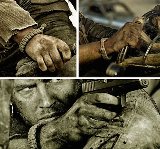 「怒りのデス・ロード」のみならずトム・ハーディが私生活でも愛用しているパラコード・ブレスレット。本編のものは“ダイヤモンドノット”という方式で結び玉を作っていますが、本製品はあえて簡易的な玉結びで、フリーサイズ対応としてあります。1080円。