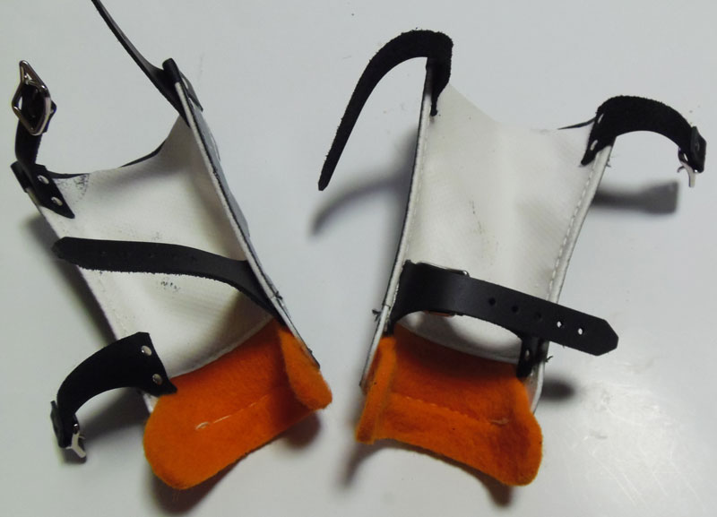 この二枚の画像を見ると、グース右腕のベルト剣先とバックルの取り付け方向が、一箇所逆になっている事がわかります。