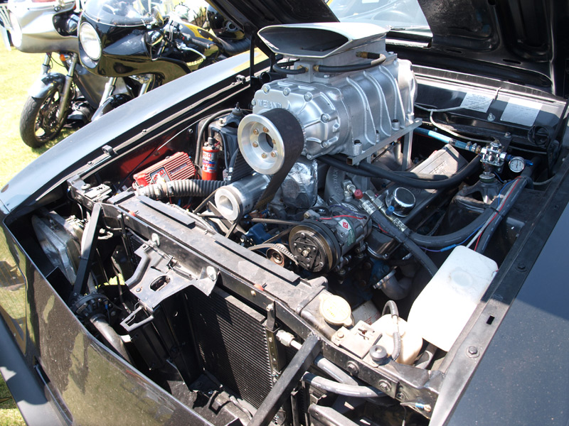 ボンネットを開けると、なんと複雑に入り乱れたベルト類。これはアクセルとチャージャーの回転を同期させるというユニークな仕掛け。加えてホースからエアーを出し、劇中っぽいスーパーチャージャー音の再現にチャレンジしておられました。