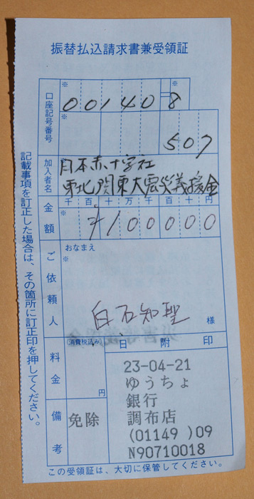 売上21万余円。そこから経費をさっぴいて、今回は10万円を義援金として日本赤十字社へ寄付しました。