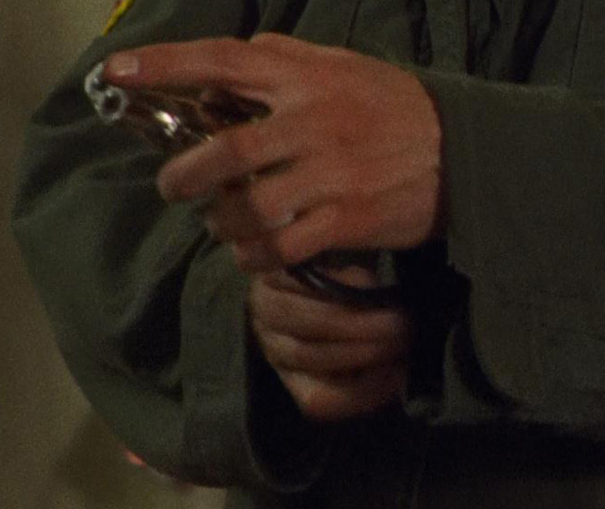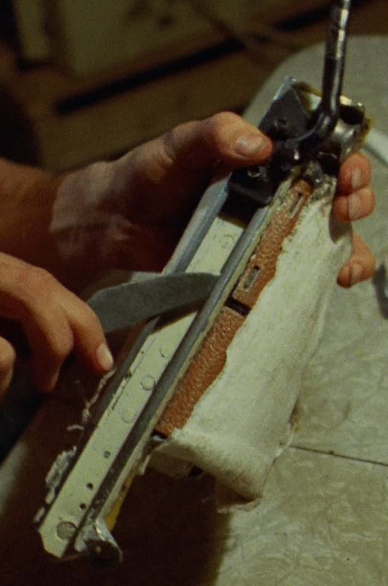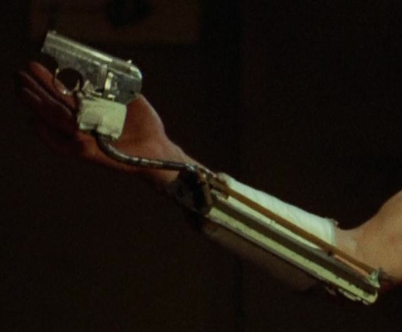 袖に戻すときのカット。銃のグリップから伸びるスリーブガンのアームが見えています。