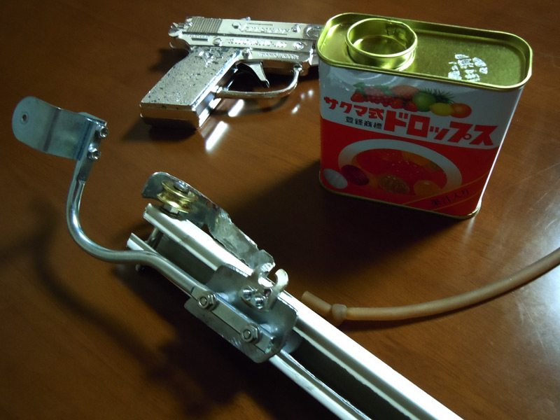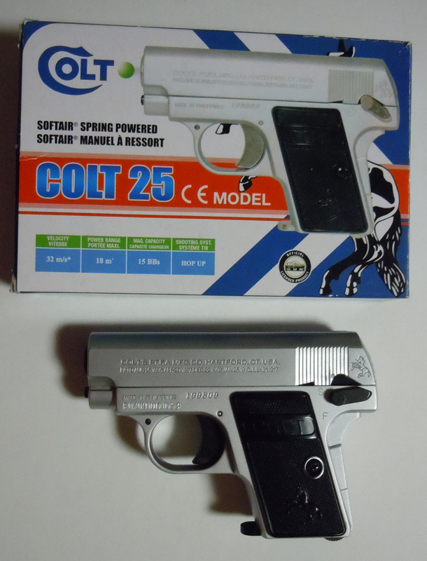 あと、現在、メーカーさんと打ち合わせ中なのですが、次バージョンより出荷時に取り付けている銃が変更になります。メッキギラギラのカネキャップ銃から、仏サイバーガン社のエアーコッキングガン、コルト25へチェンジです。
