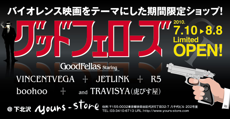 で、来月、7/10〜8/8。下北沢のショップスペースの一角をお借りして、映画Tシャツ系扱いの5ブランドが集まって、期間限定ショップを開催する事になり、そこに混ぜてもらう事になりました。