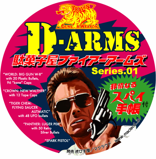 あと、スパイ手帳と同時にすすめている駄菓子屋の鉄砲おもちゃの詰め合わせセット「駄菓子屋ファイアーアームズ」のラベルも完成。
