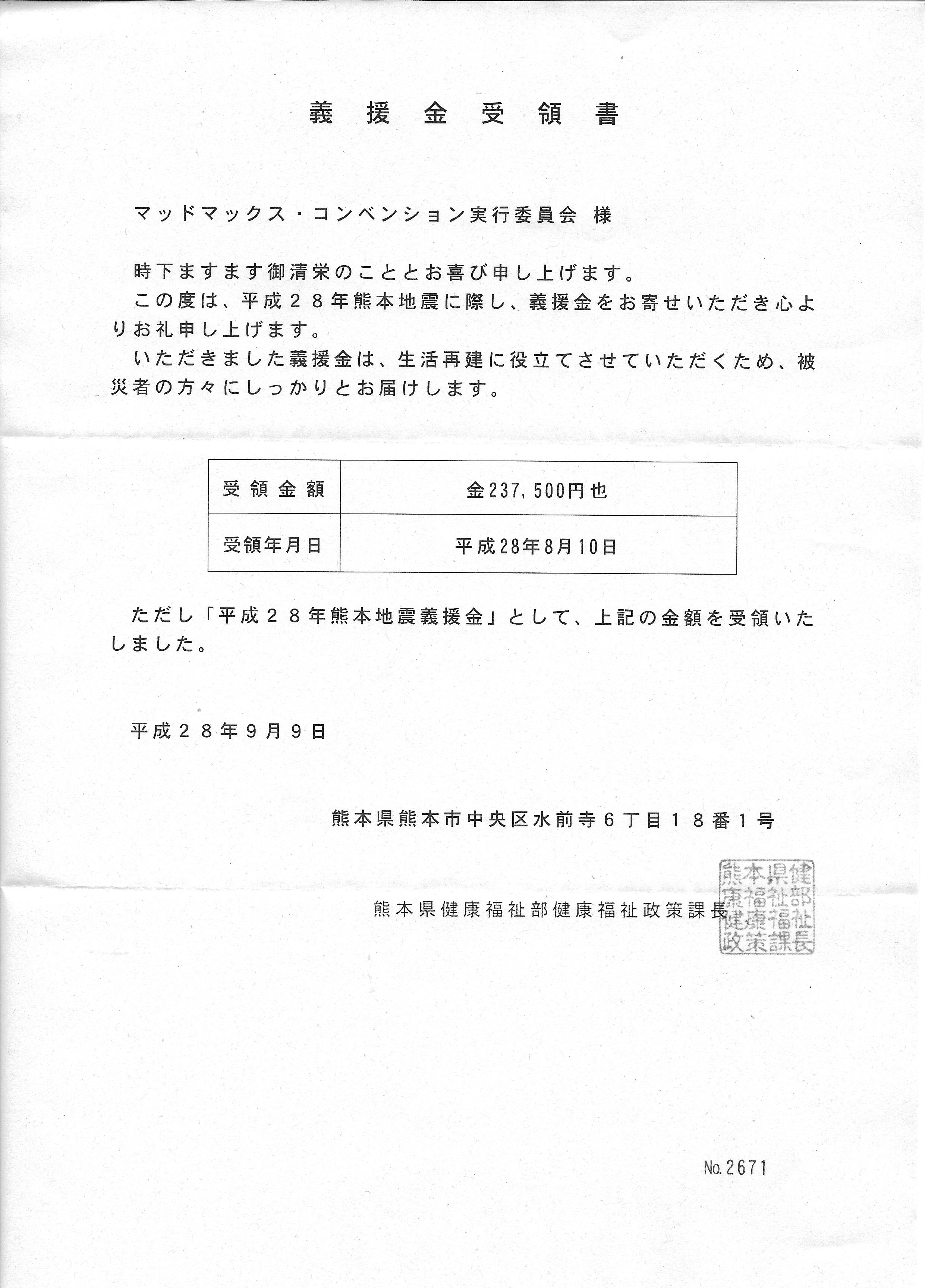 マッドマックス・コンベンション2016、チャリティ売上の熊本への送金の報告です。
